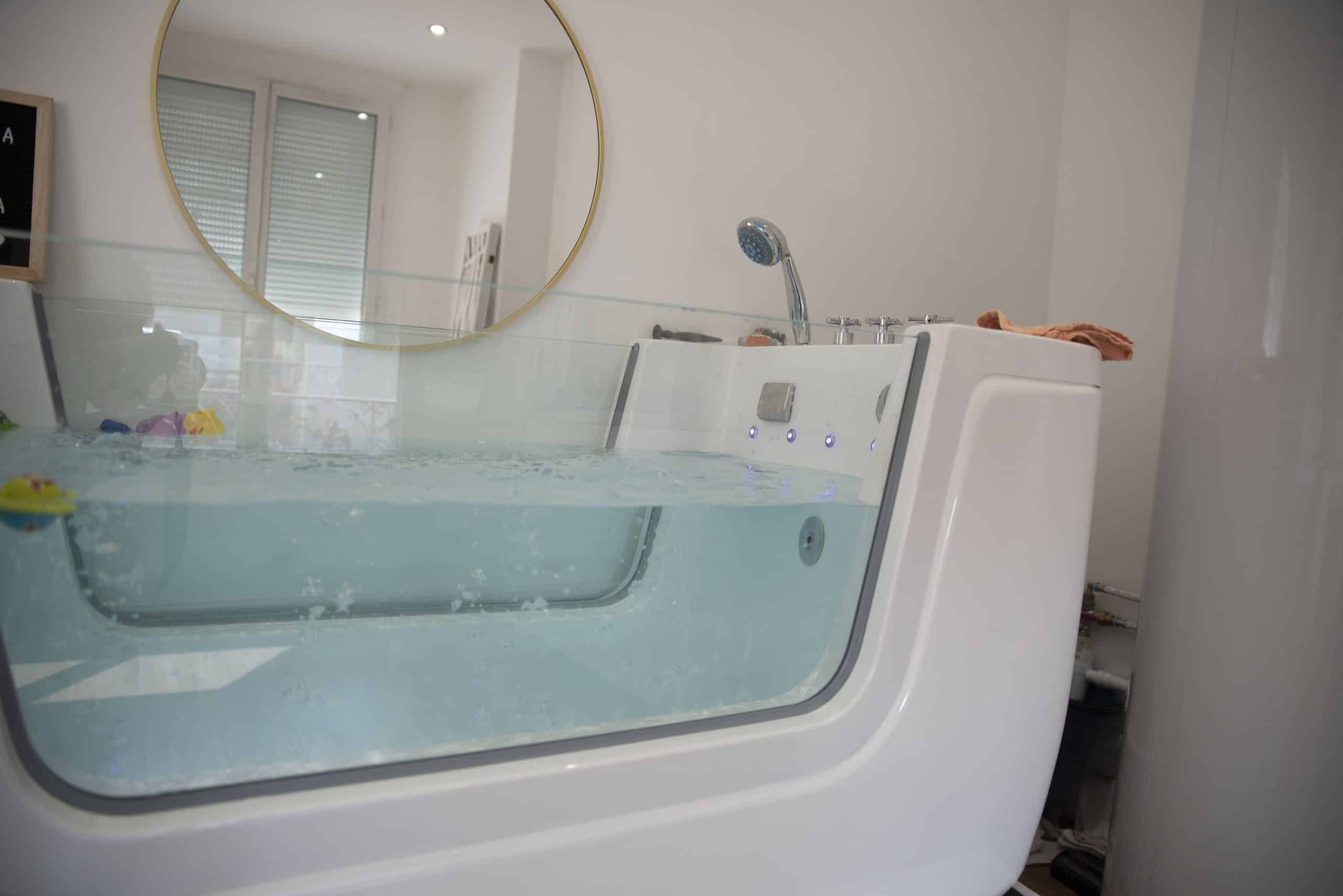 « Chatouillé par de petites bulles, il pourra être libre de ses mouvements. Grâce à une bouée adaptée, il partira à la découverte d’une eau chauffée et non chlorée. »