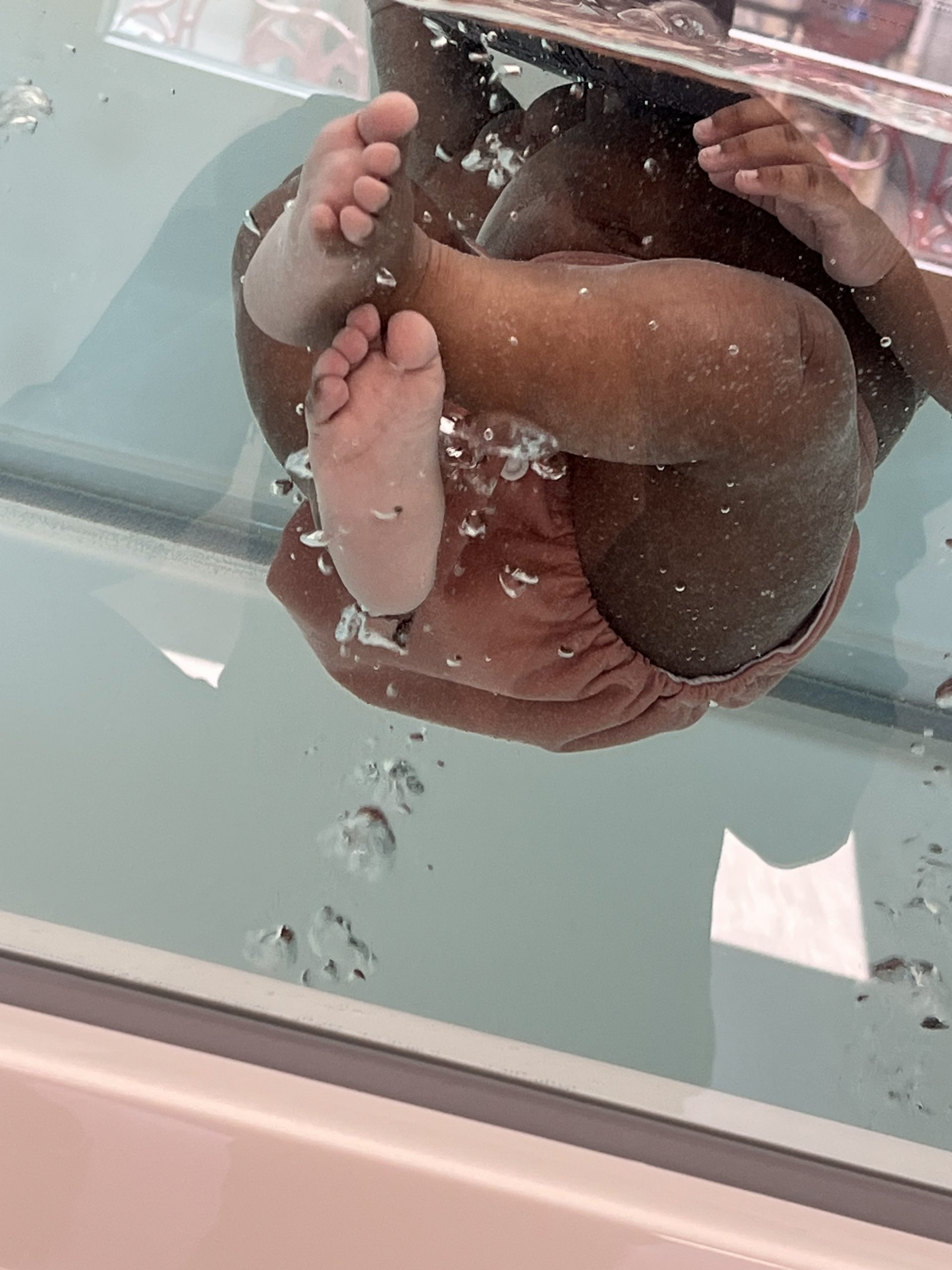 Pendant la séance baby spa, bébé nage doucement dans une eau chaude, pour un moment calme et relaxant.